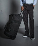 Internal mesh pockets, concealed trolly, compressions straps, removable adjustable webbing shoulder strap including non slip pad, webbing carry handles, Neoprene grip, sliders on base, front zippered pocket, internal side mesh pockets, internal closing compression straps, heavy duty wheels.